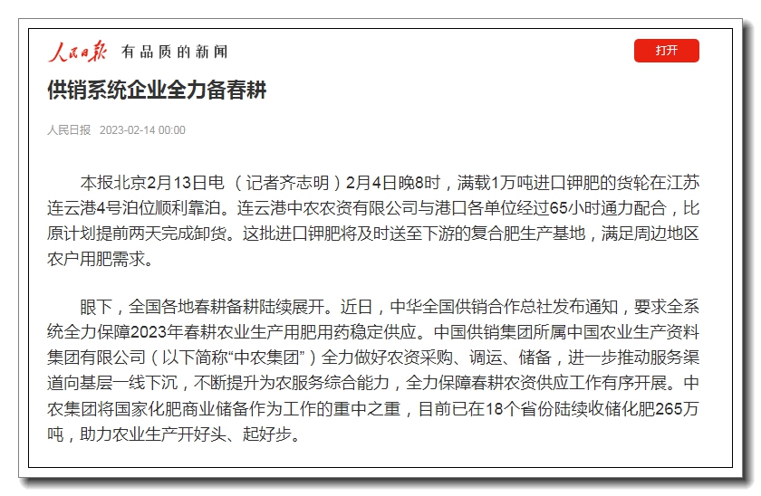 眼下,全國(guó)各地春耕備耕陸續(xù)展開。近日,中華全國(guó)供銷合作總社發(fā)布通知,要求全系統(tǒng)全力保障2023年春耕農(nóng)業(yè)生產(chǎn)用肥用藥穩(wěn)定供應(yīng)。中國(guó)供銷集團(tuán)所屬中國(guó)農(nóng)業(yè)生產(chǎn)資料集團(tuán)有限公司(以下簡(jiǎn)稱“中農(nóng)集團(tuán)”)全力做好農(nóng)資采購(gòu)、調(diào)運(yùn)、儲(chǔ)備,進(jìn)一步推動(dòng)服務(wù)渠道向基層一線下沉,不斷提升為農(nóng)服務(wù)綜合能力,全力保障春耕農(nóng)資供應(yīng)工作有序開展。中農(nóng)集團(tuán)將國(guó)家化肥商業(yè)儲(chǔ)備作為工作的重中之重,目前已在18個(gè)省份陸續(xù)收儲(chǔ)化肥265萬噸,助力農(nóng)業(yè)生產(chǎn)開好頭、起好步。